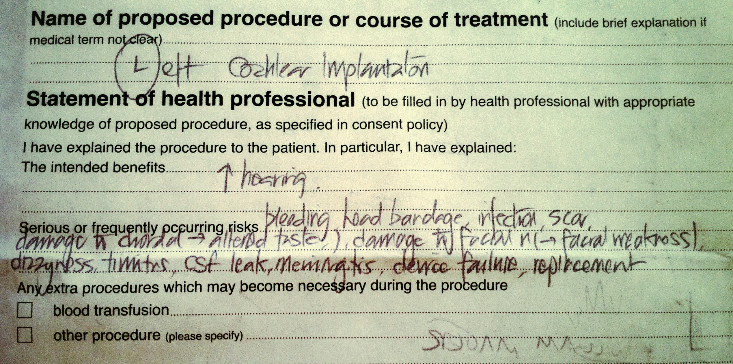 At about 1pm on Friday I was lying on a hospital bed in my gown and DVT socks (not my sexiest look), when a very nice doctor came to take me through the final pre op briefing. He showed me the disclaimer form I had to sign, which gave me pause for the first time in the 18 months or so I’ve spent in the process of getting a cochlear implant. You can see the form at the top of this page but the handwriting might not be the easiest to read.